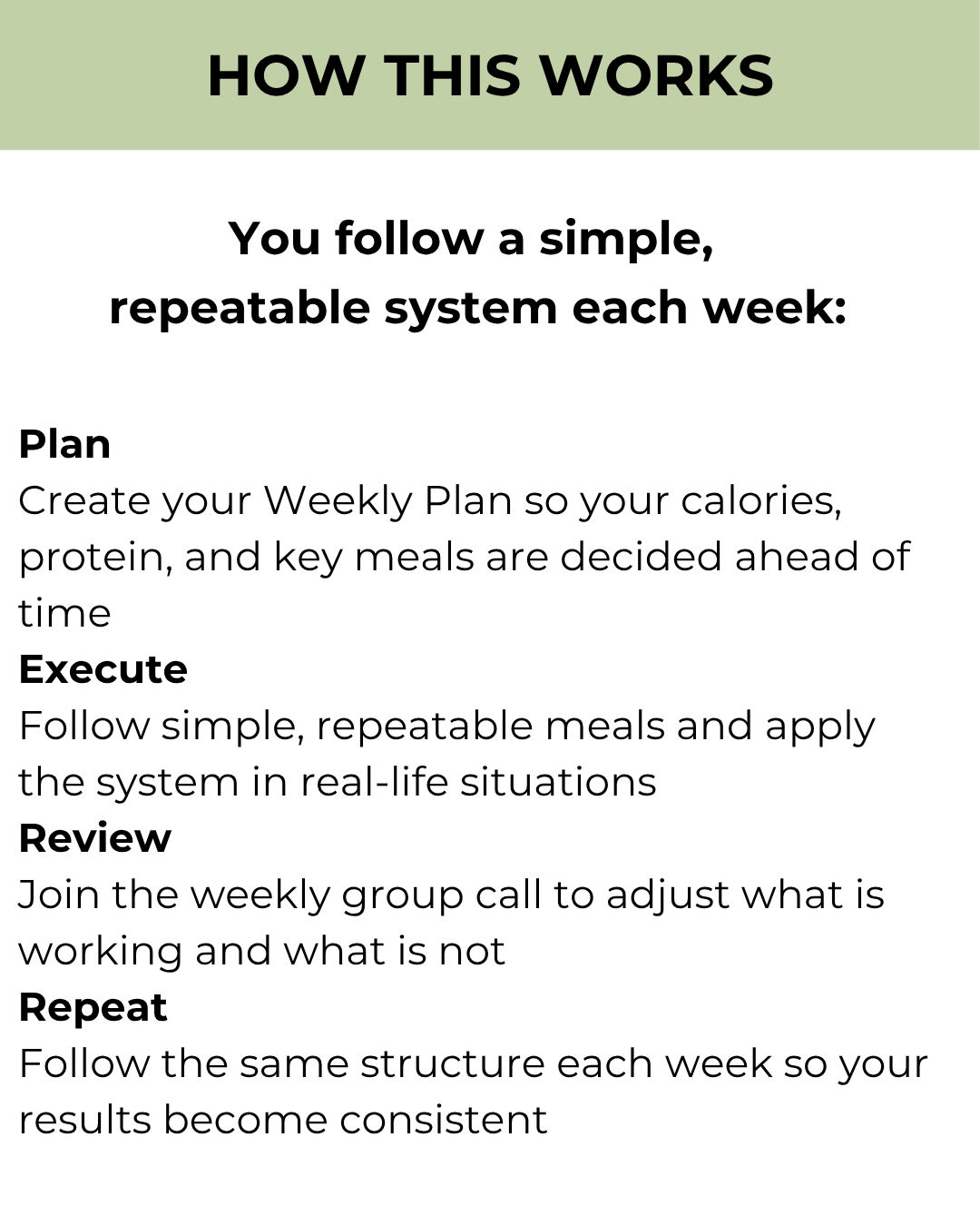 Inside Predictable Progress™, you will learn how to follow a weekly system that makes your weight loss predictable, even when life gets busy.